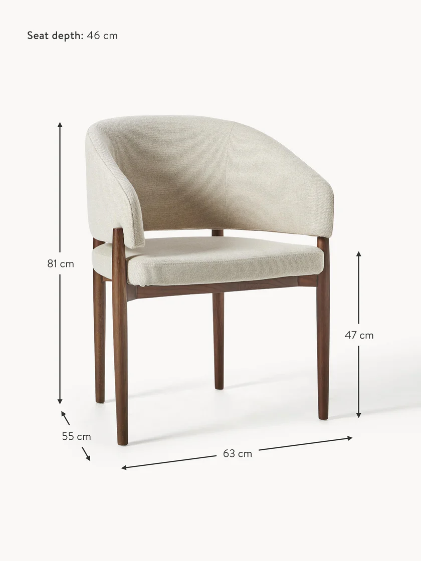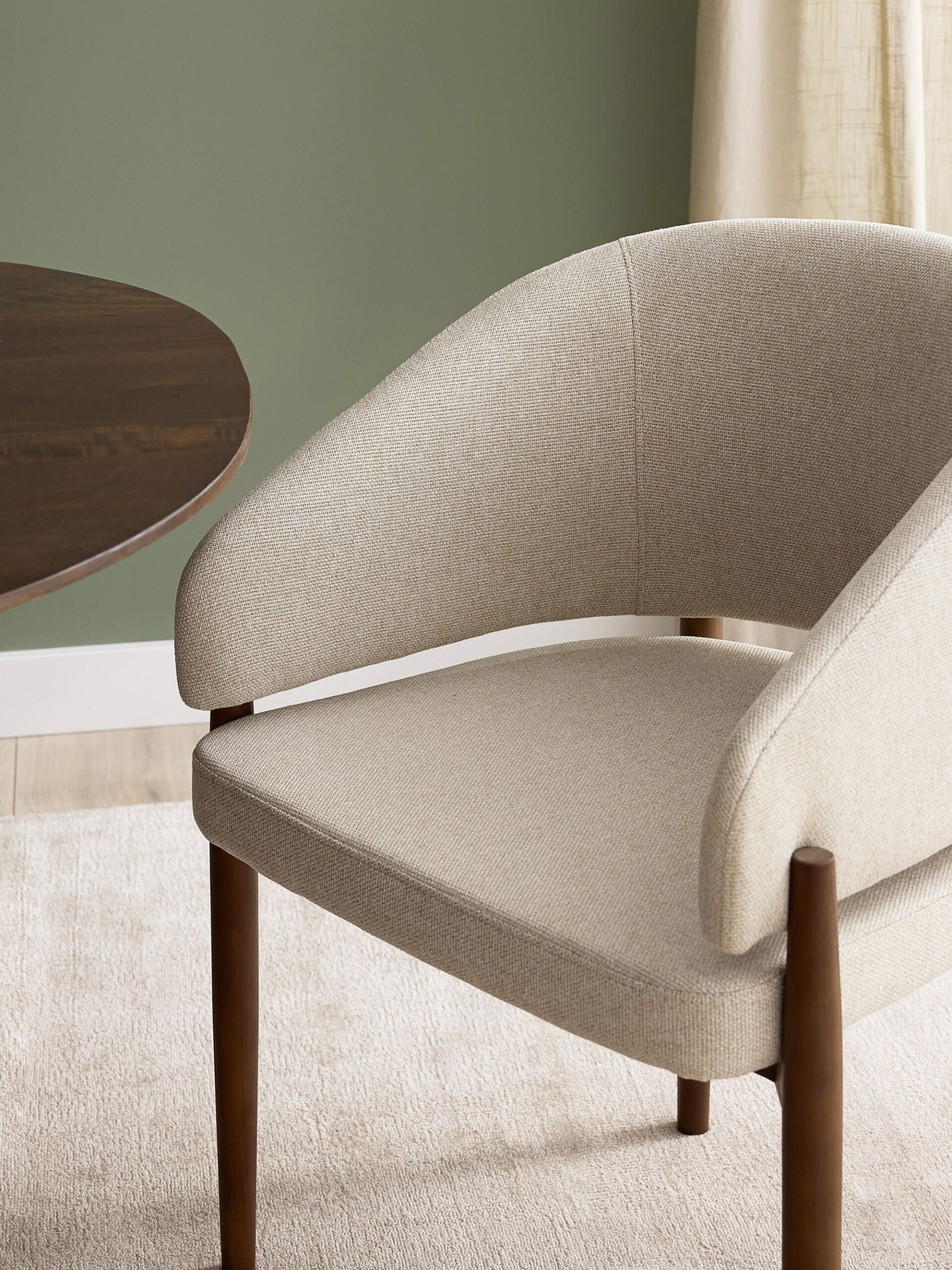 De gestoffeerde armleunstoel NYRA is het toppunt van stijl en comfort. Met zijn elegante rondingen en zachte bekleding is hij niet alleen buitengewoon comfortabel, maar ook een subtiele blikvanger. Of je hem nu plaatst in de eetkamer, werkkamer of woonkamer – NYRA past perfect bij elk interieur en geeft net dat beetje extra. De warme houttinten en het verfijnde design maken het gegarandeerd tot je nieuwe favoriete zitplek in huis.