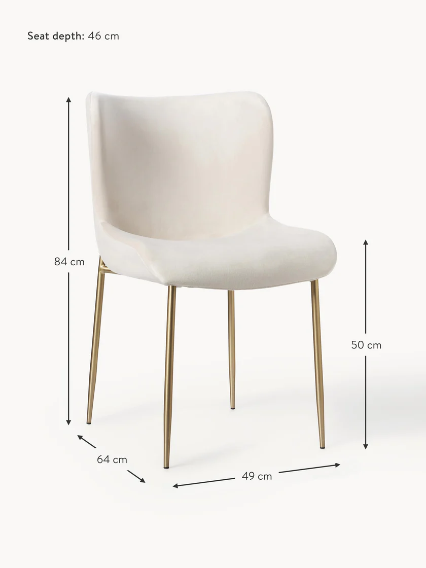 Deze supercomfortabele stoel combineert elegantie en comfort in één stijlvol ontwerp. De afgeronde vormen, het fluwelen zitvlak en de goudkleurige poten geven een moderne, luxueuze uitstraling aan elke eethoek. Perfect om in te ontspannen — van het voorgerecht tot het nagerecht.